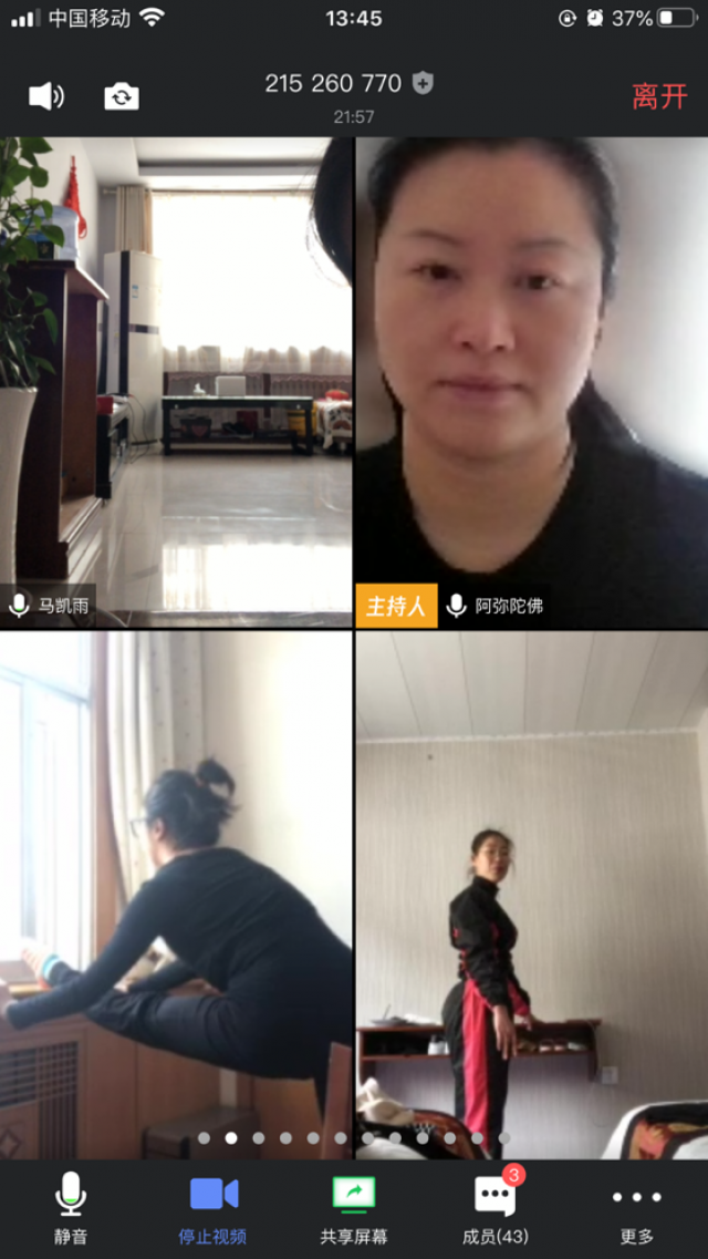2020年3月16日下午5、6节课,体育艺术学院中国舞方向学生在腾讯会议展开了把杆一位擦地、蹲、五位擦地组合编排的学习。