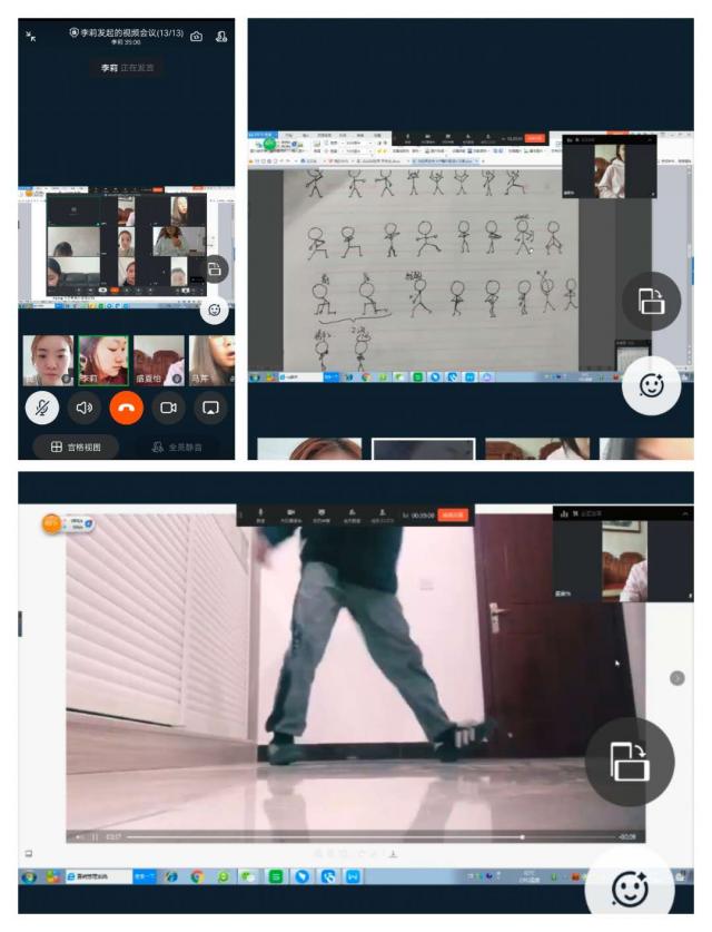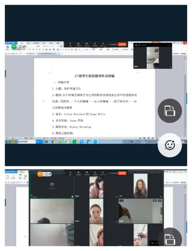 2020年3月17日上午,2017级流行舞专业的同学们,在李莉老师的带领下在钉钉上对齐舞风格作品分组编创进行了线上学生之间讨论并实践编创内容、李莉老师给予引导。本堂线上课程主要对男生齐舞作品编创进行了讨论和剖析,男生作品主题为以保护环境卫生为主,以易拉罐为道具而引发的一系列故事反映出的社会现象。在李莉老师的点评和文案批注下,让我们更加明确了创作背景、运动道具、音乐风格、元素运用等应该相互统一,通过看男生的编创视频展开了讨论并提出问题,在李莉老师的帮助下一一解答。本堂课通过李莉老师的引导让同学们明白了音乐过渡、动作设计等一些列因素在舞蹈编创中的重要性。