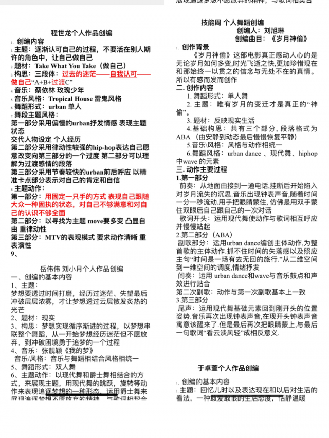同学们把自己构思的舞蹈和音乐用word对每段音乐舞蹈加入的每一个部分进行分析设计框架。对同学们的舞蹈构思,文字具体逻辑结构,结构设计提出意见。重点强调舞段的过度,基本的环境人物、情景,动作和音乐的拆分,在李莉老师的指导修改下同学们对自己创作有了进一步的想法,同学们再将自己的内容进行修改
