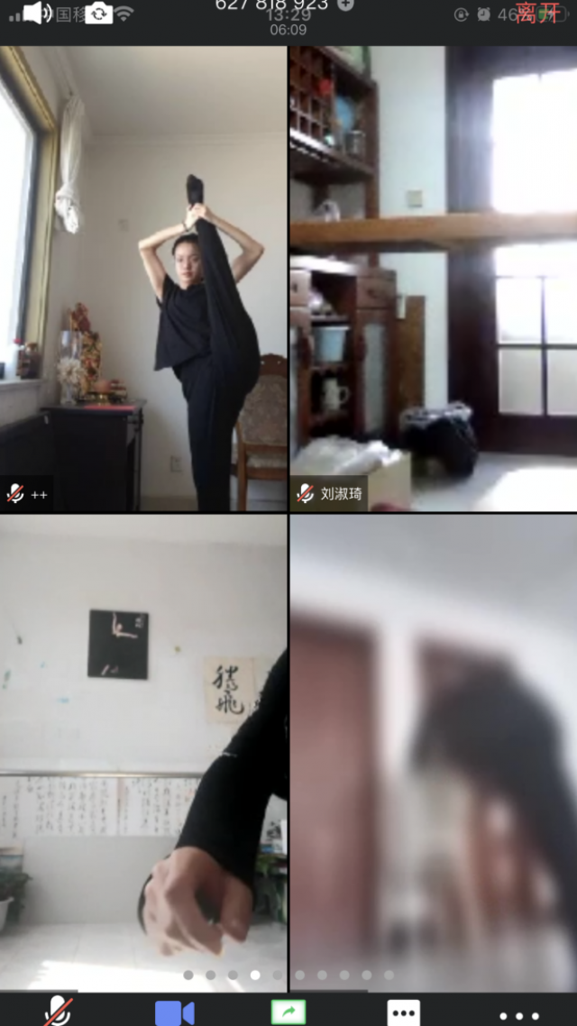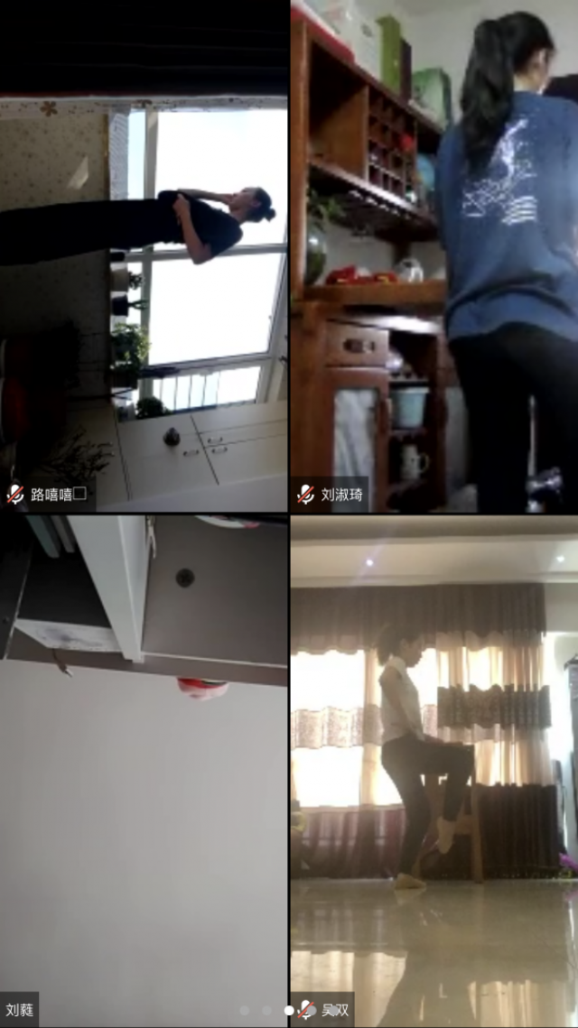 2020年3月17日下午5、6节课,体育艺术学院中国舞方向学生在腾讯会议展开了把杆小踢腿、划圈、单腿蹲组合的编排。
