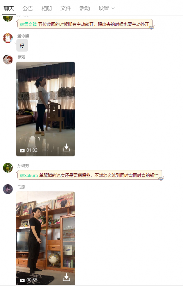 课堂分为三部分,为了保护大家的安全,首先进行自由热身和软开度的练习。然后孙琳芳老师提出组合的要求,最后由同学们自主编排组合,孙老师进行线上指导。编排完成后上传至QQ群由孙老师反馈点评。